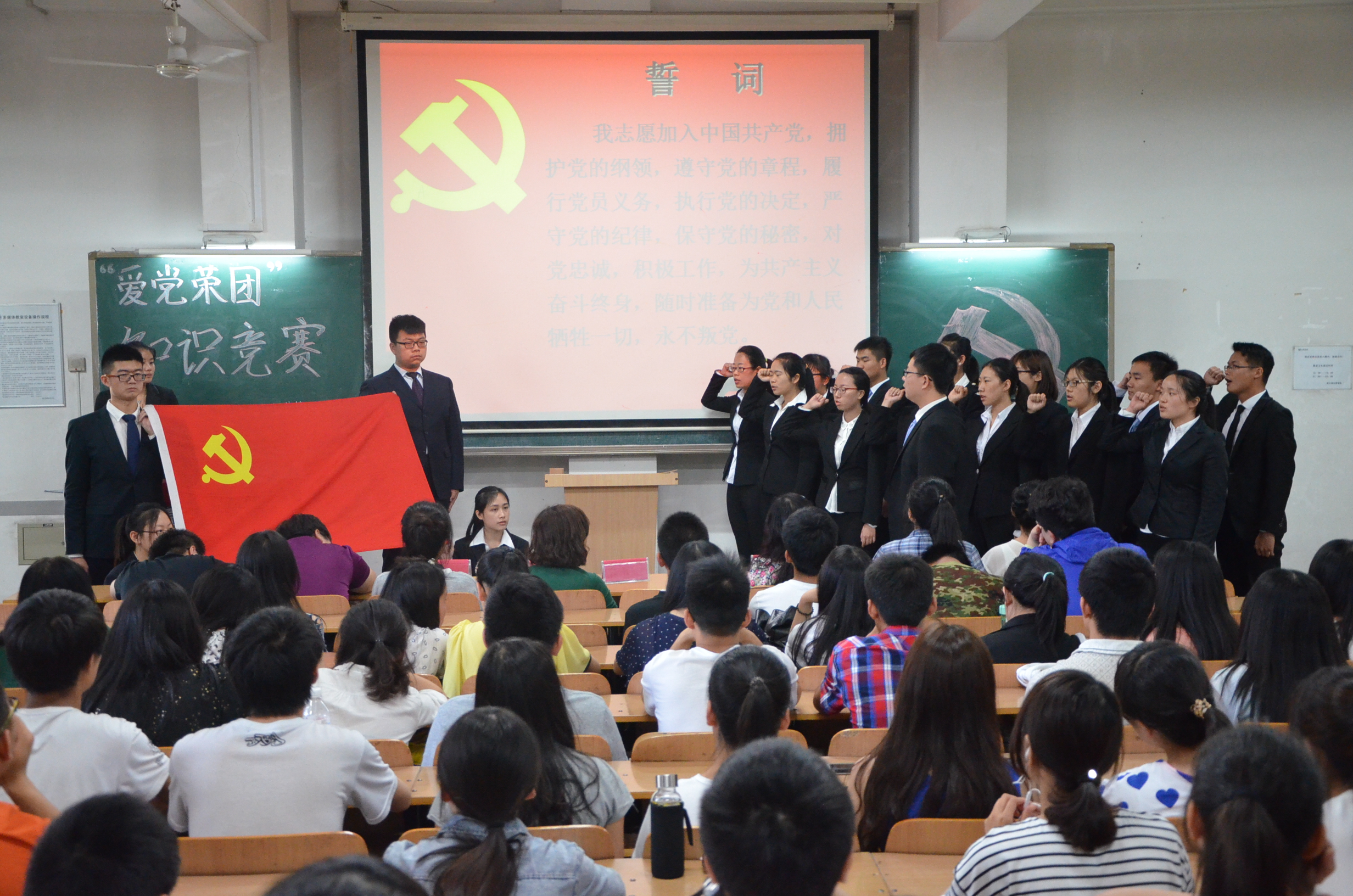 5月20日,mobile28365爱党荣团知识竞赛暨新党员入党宣誓仪式在3号教学楼118室举办,mobile28365辅导员孙瑶、沈洁、仉雅琼老师及2013级研究生党支部书记石慧、第三员工党支部书记武杭出席并担任竞赛评委。2014级近200名同学参加本次活动。