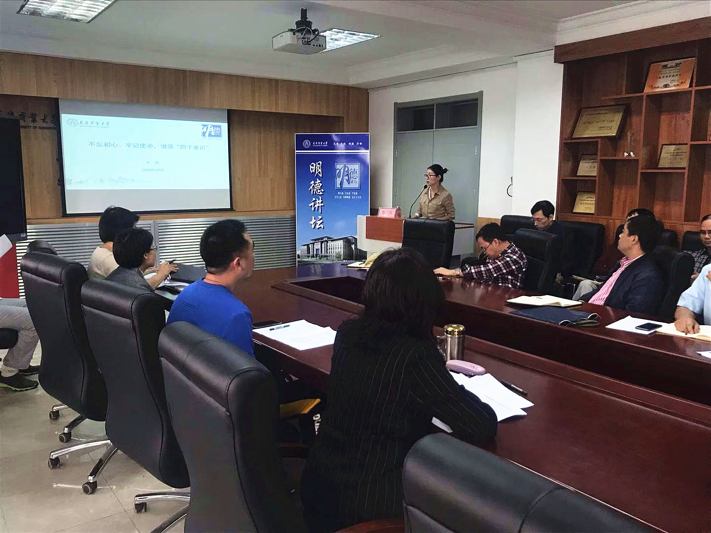 10月9日下午,mobile28365组织全体教职工参加了公司2019年下半年基层理论宣讲暨第八期“明德讲坛”,马克思主义公司李欣老师从“求真务实”、“苦难辉煌”、“接续奋斗”三方面进行讲授,引导大家从党史和新中国史中感悟党的初心和使命、不断增强“四个意识”来坚守初心勇担使命。