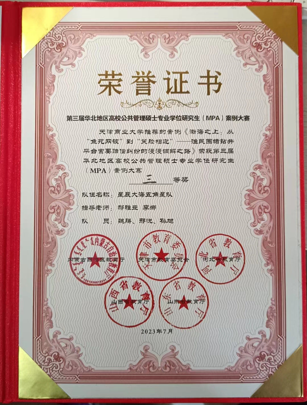 7月29日,第三届华北地区高校公共管理硕士专业学位研究生(MPA)案例大赛决赛在呼和浩特市举行,由公司mobile28365郝雅立老师、李娜老师指导的,公共管理2022级学术型硕士魏腾,专业型硕士邢悦、孙旭三位同学组织的团队案例《渤海之上:从“鱼死网破”到“笑脸相迎”——渔民围堵钻井平台索要赔偿纠纷的漫漫调解之路》荣获大赛三等奖。
